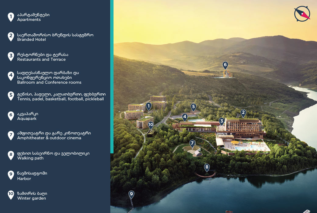 The apartments are fully renovated and furnished, equipped with modern appliances. Guests and apartment owners will enjoy access to the full range of amenities in the Le Meridien Sioni Lake Resort & Spa by Archi complex, including: 2,500 sq. m. of indoor and outdoor pools; a water park and a winter outdoor hot pool; a 3,000 sq. m. spa, wellness center, and fitness room; a banquet hall for 550 people, conference rooms, and a terrace; five restaurants, a bar, a lounge, and cafes; an outdoor cinema and amphitheater; a children's entertainment area; a winter garden; a helipad; a 3 km boulevard along the lake with walking and cycling paths; tennis, basketball, and football fields; padel courts; a fishing area; and a zip line.