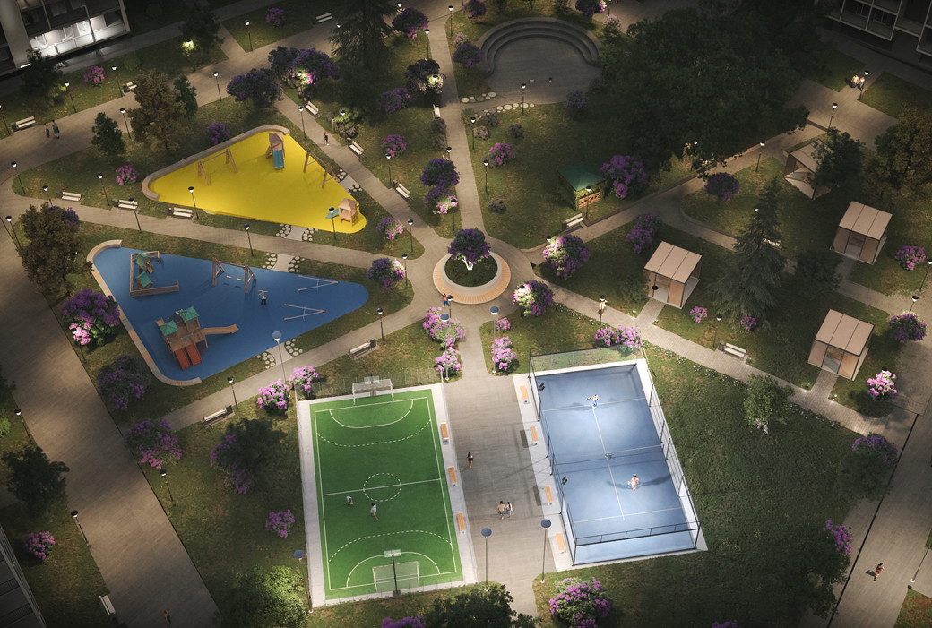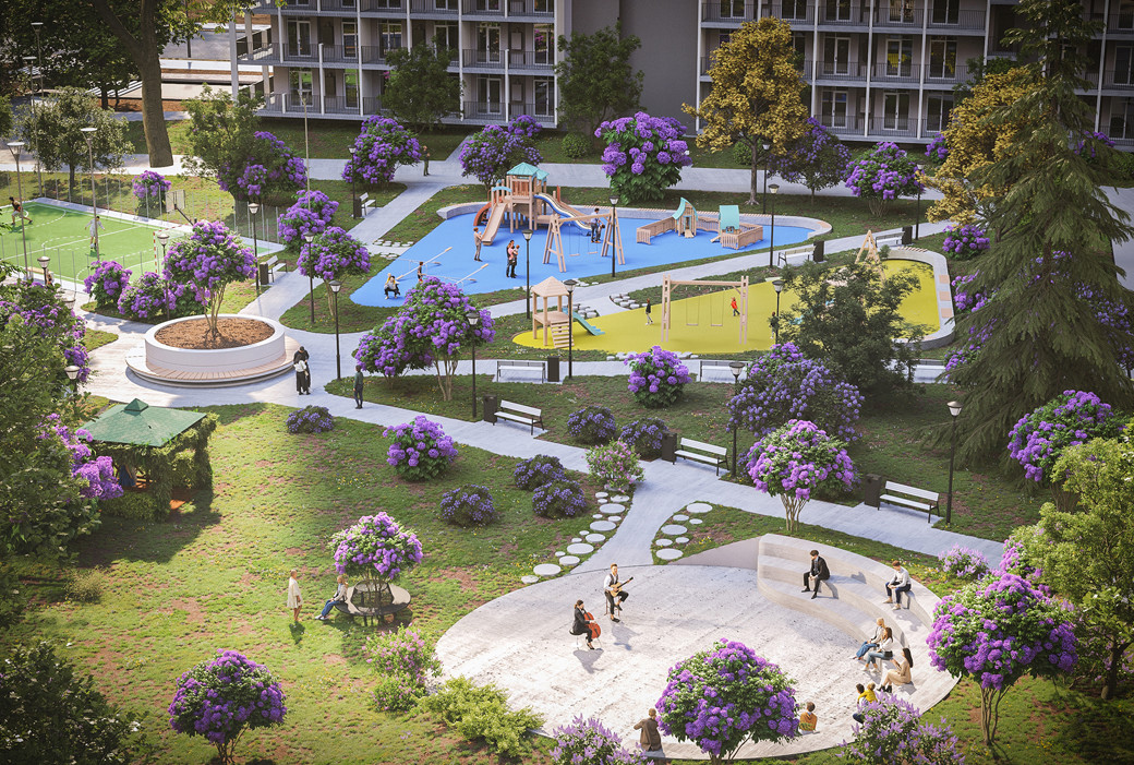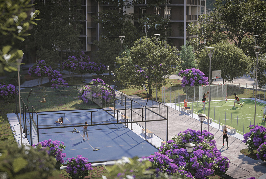 Арки Lilacs выделяется благоустроенным внутренним двором площадью 12 000 кв.м с садом сирени. Здесь предусмотрено всё для гармоничной жизни — спортивная площадка, корт для падела, тренажёрный зал, детская развлекательная зона и соседский лаунж.